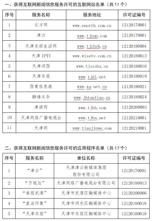 自《互聯網新聞信息服務管理規定》頒布實施以來,天津市互聯網信息辦公室負責組織開展本市互聯網新聞信息服務許可工作。現將天津市互聯網新聞信息服務單位相關許可信息依法予以公開,包括:互聯網站11個,應用程序17個,公眾賬號56個,共計84個服務項。